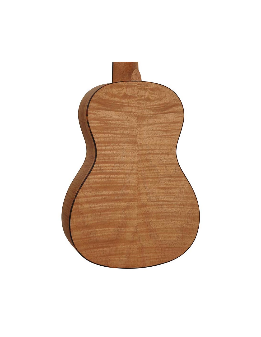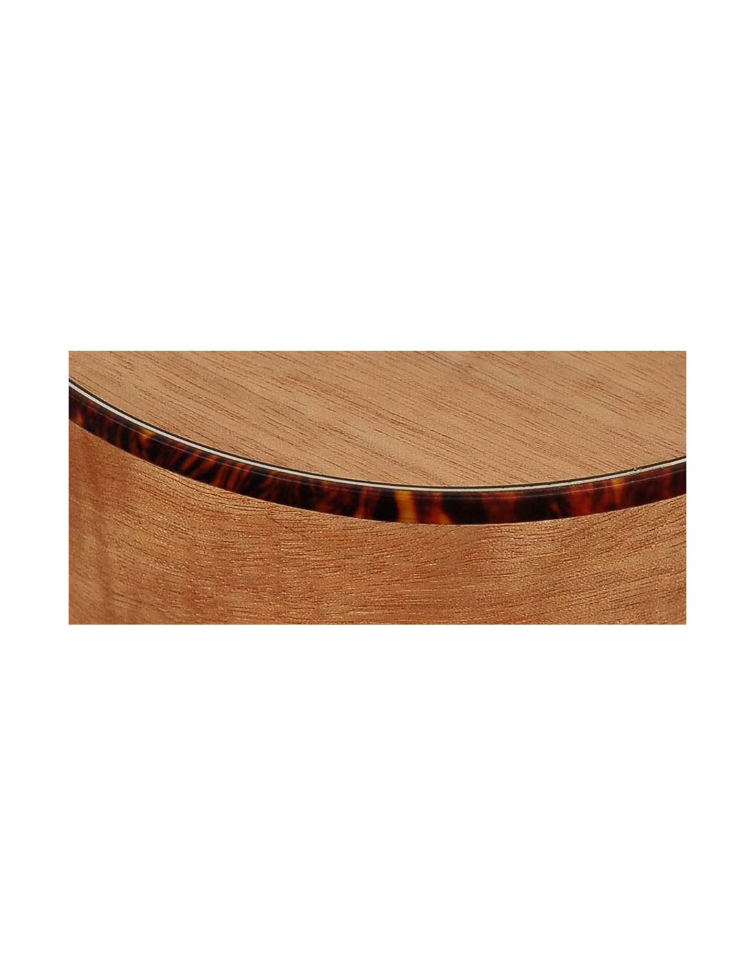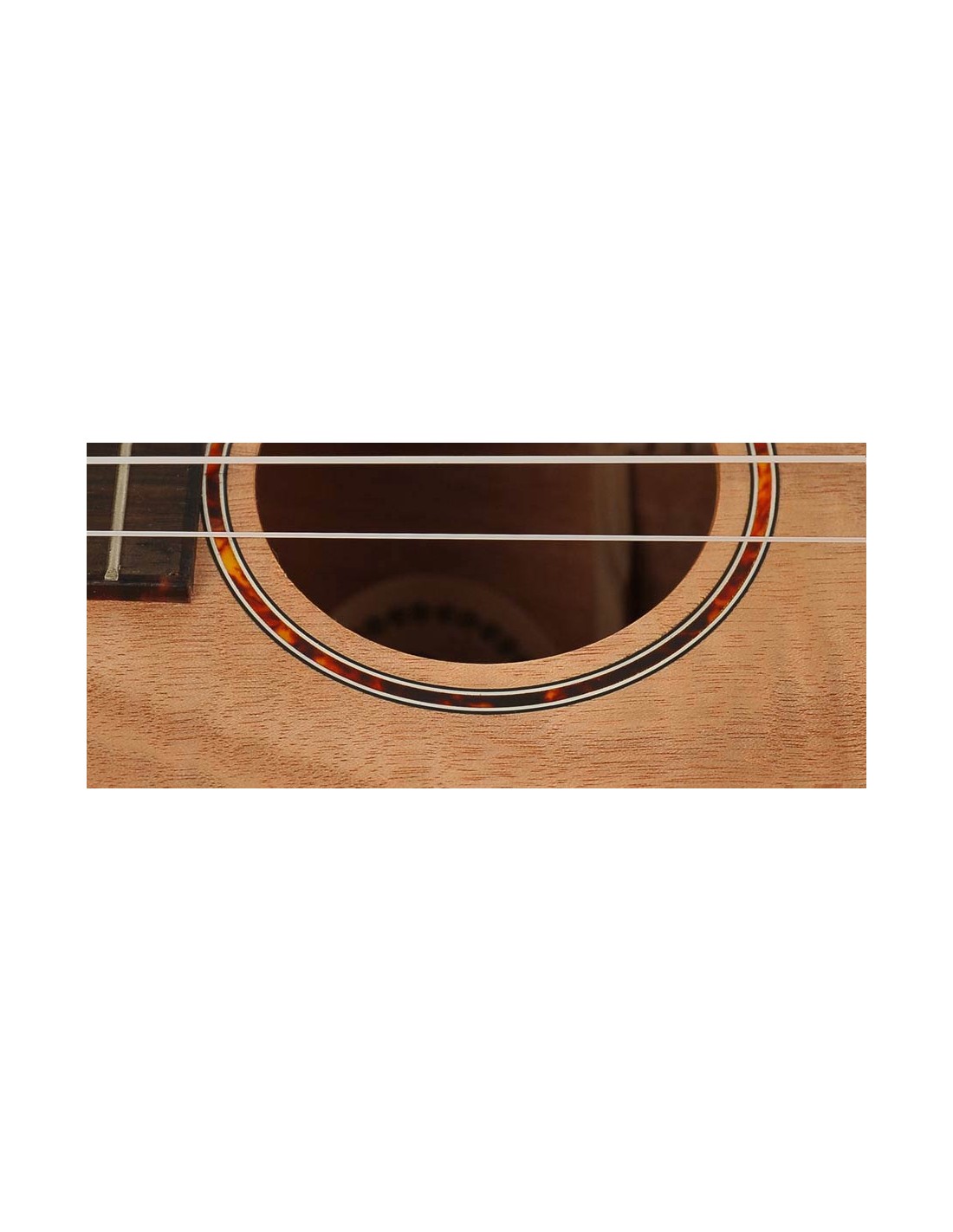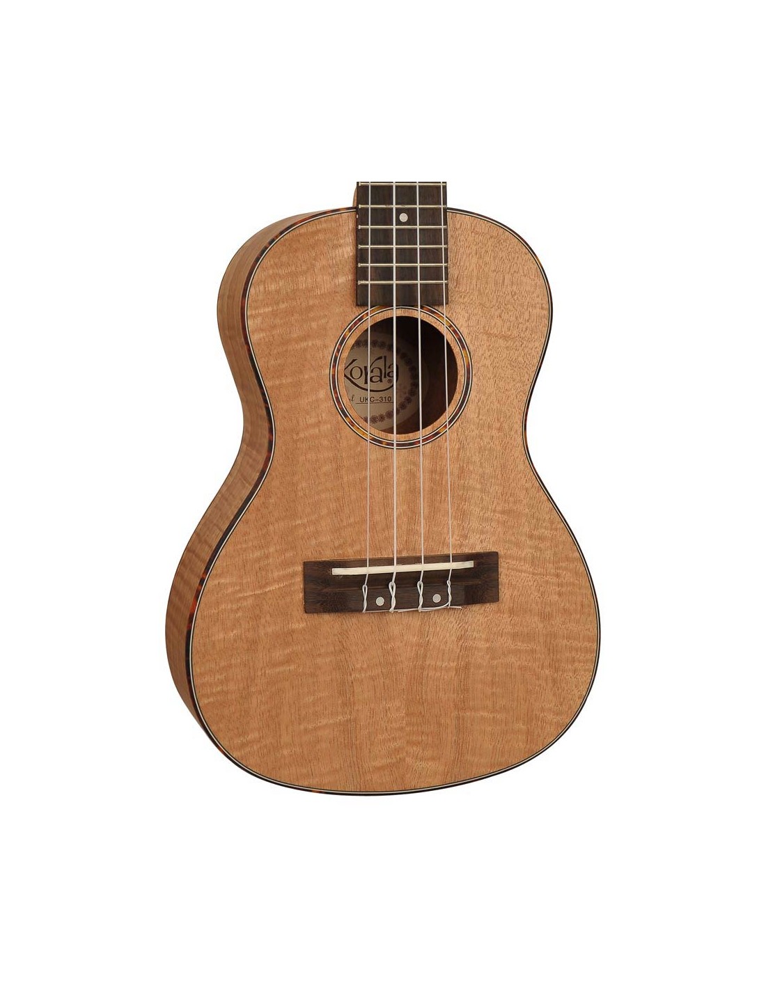 This Korala concert ukulele has got a flamed okoume body which makes it look very stylish. The instrument is finished with a turtle-like binding and abalone rosette. The fingerboard is made of engineered wood. The instrument is nicely finished and very Smooth to the touch, just the 18 nickel frets on the fretboard. There are position marks on the fingerboard, but also very handy, on the side of the neck.