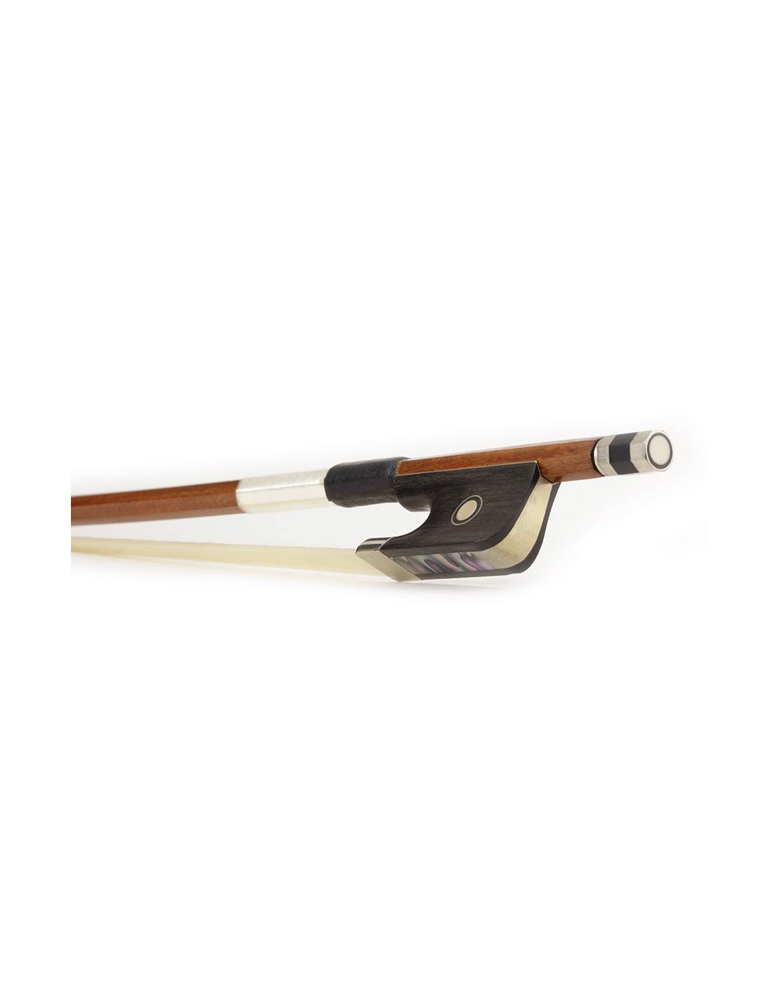 cello bow, 3/4, wamara, octagonal stick, ebony frog, parisian eye, fully nickel mounted