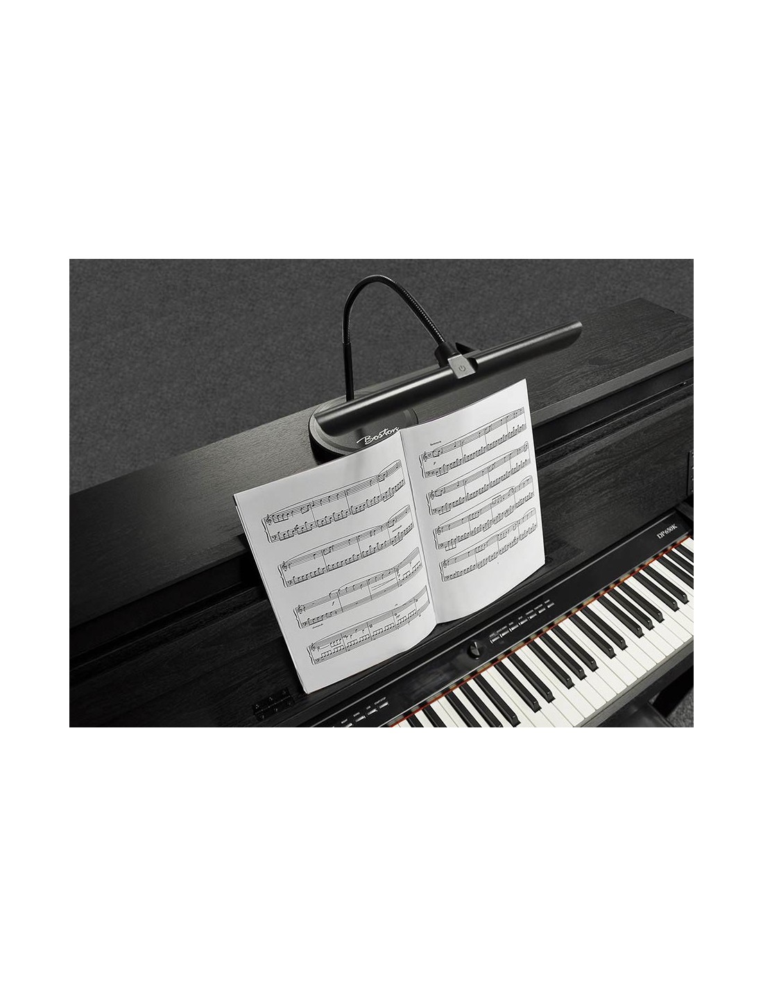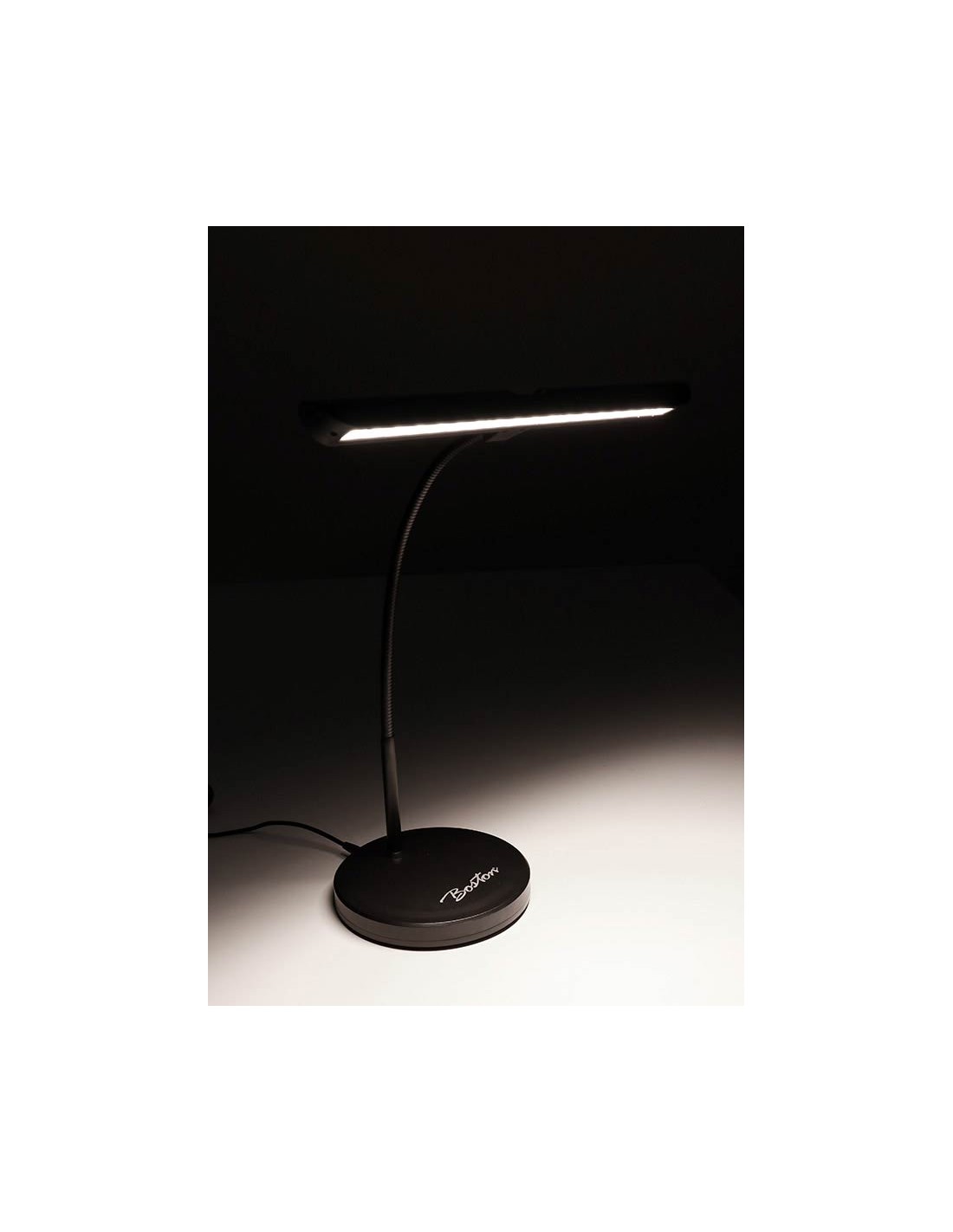 Black plastic piano lamp with 18 bright LED lights. This lamp is warm white and dimmable. This is easily adjustable in height by a flexible gooseneck (26 cm) and is therefore ideal on an acoustic and digital piano as well as on a classical organ. The round weighted base has a diameter of 14.5 cm and the maximum height is 37 cm The lamp is delivered incl. adapter.